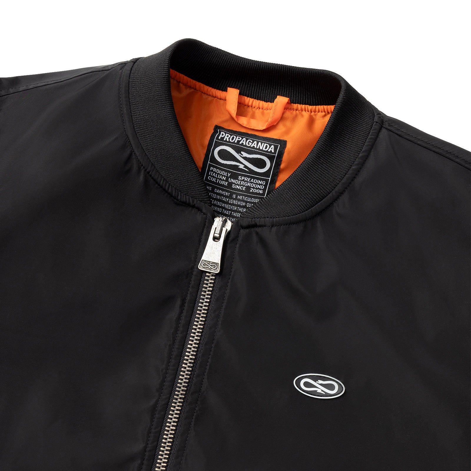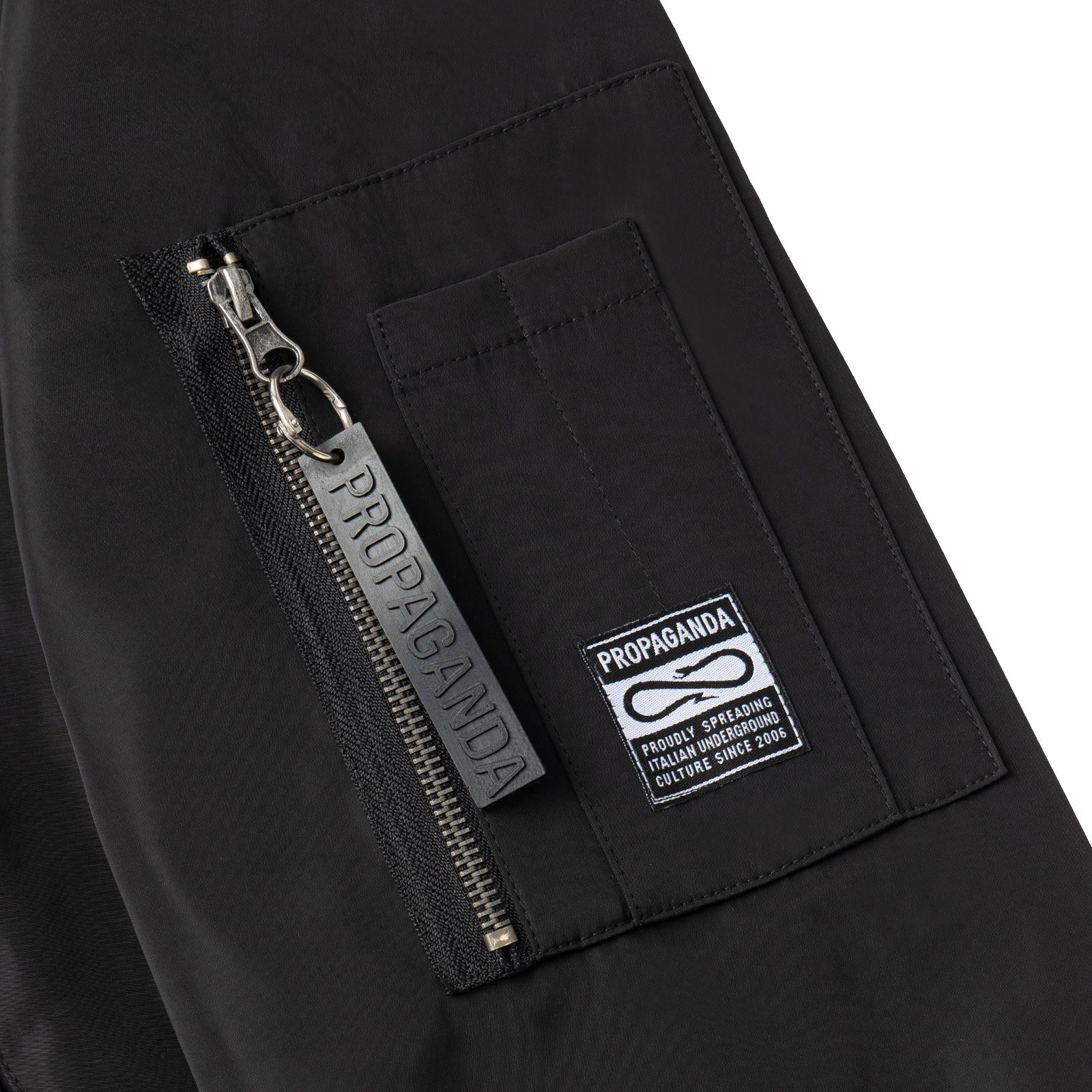 Taschino con chiusura a zip e woven patch su braccio sinistro.